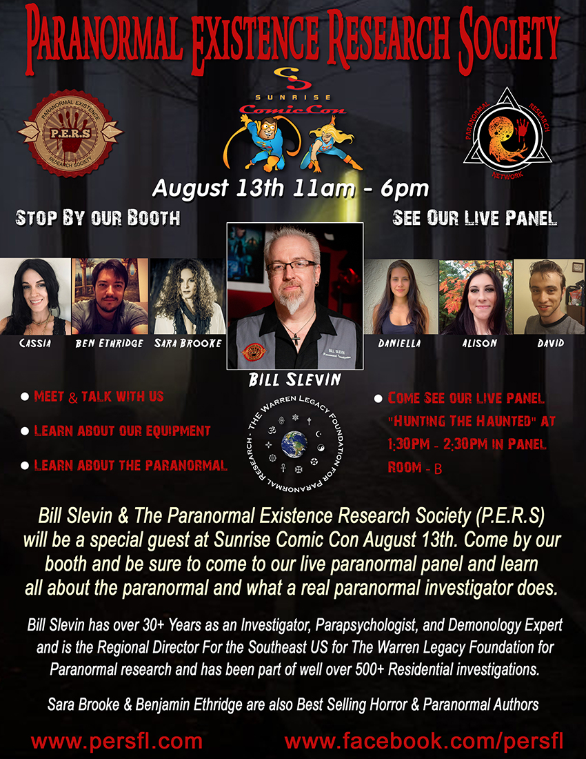 Bill Slevin and the P.E.R.S. Team will be a Special guest at the sunrise Comic Con on Saturday August 13th from 11am – 6pm. Come and meet Bill & his team at their booth all day and come and see our paranormal panel at 1:30pm. Our panel “Hunting The Haunted” will be in Panel Room B at 1:30pm – 2:30pm we explain what a real paranormal investigator does, how to investigate yourself, explain our equipment, share our experiences and also show you some of our captured evidence. Come and learn all about the paranormal from true experts in the field.